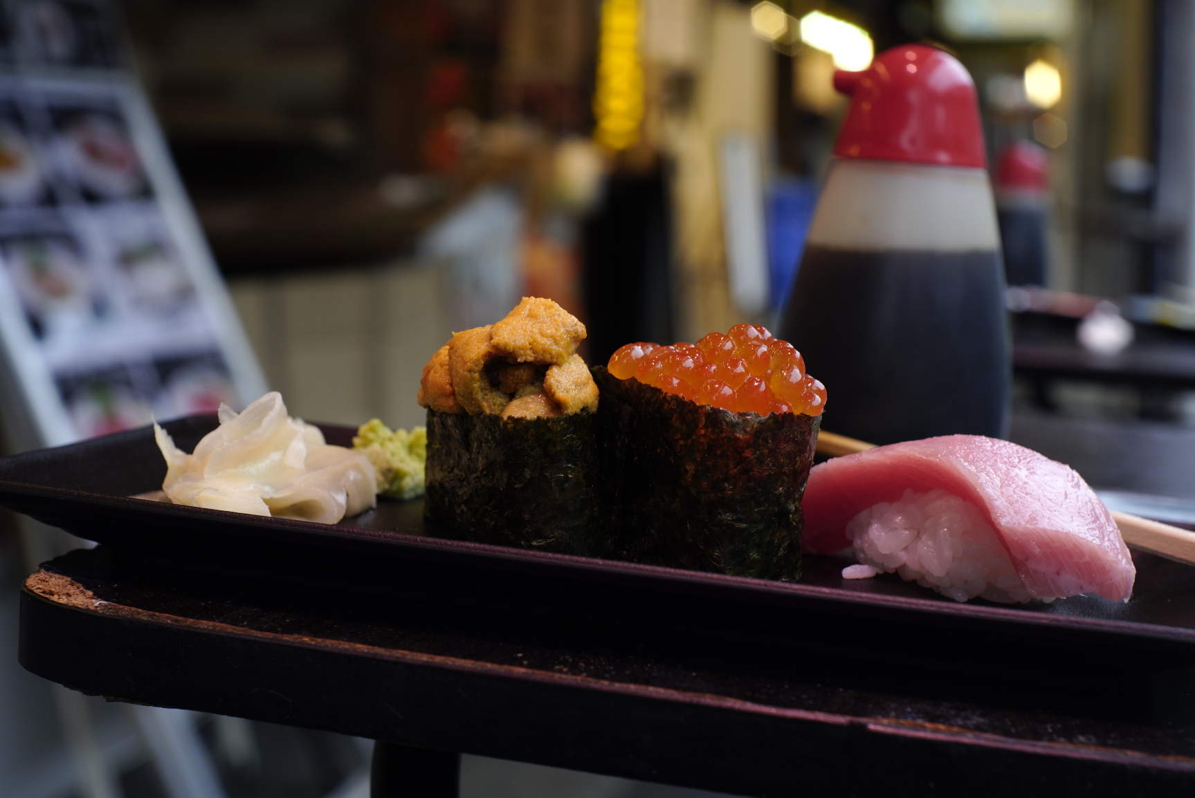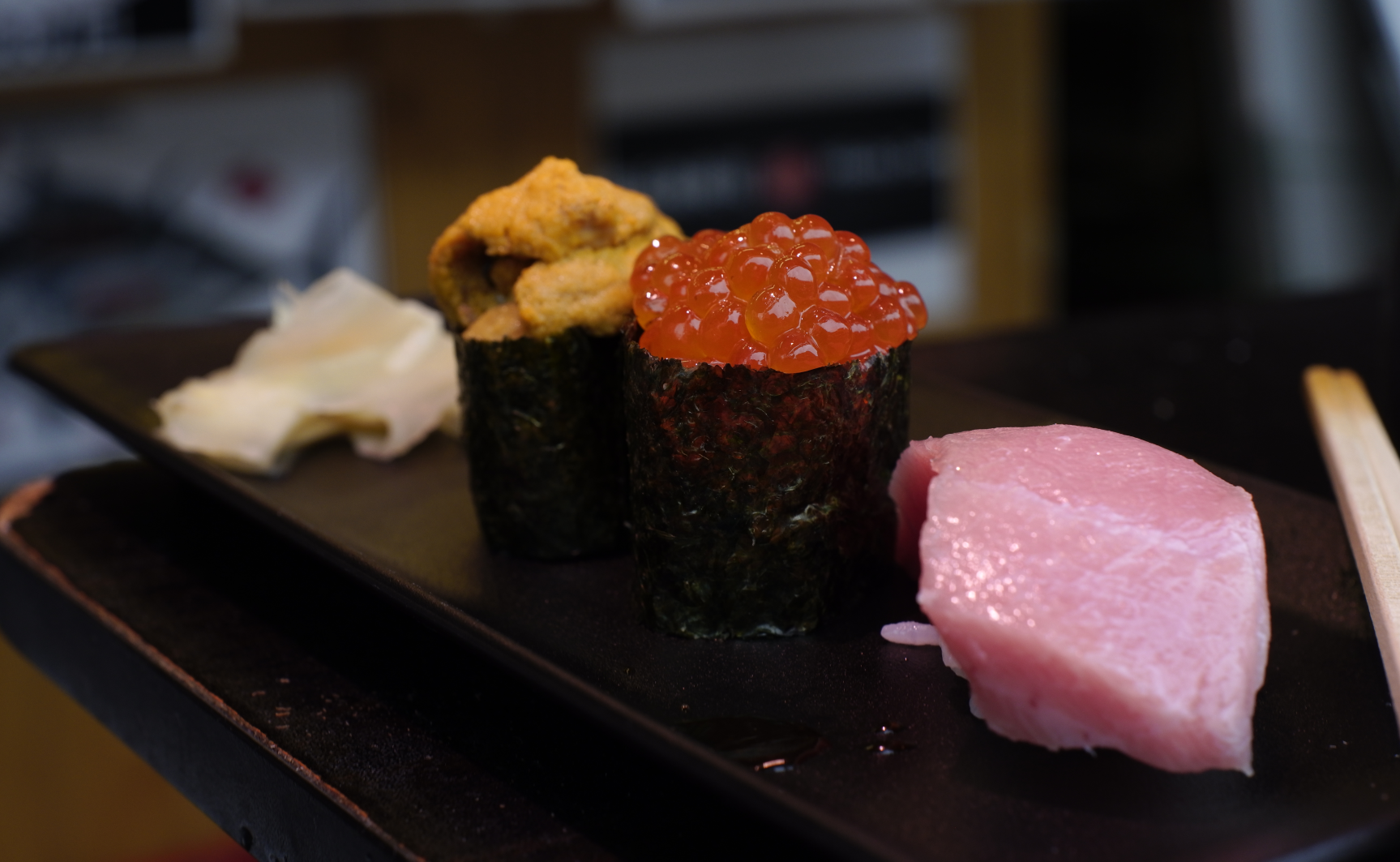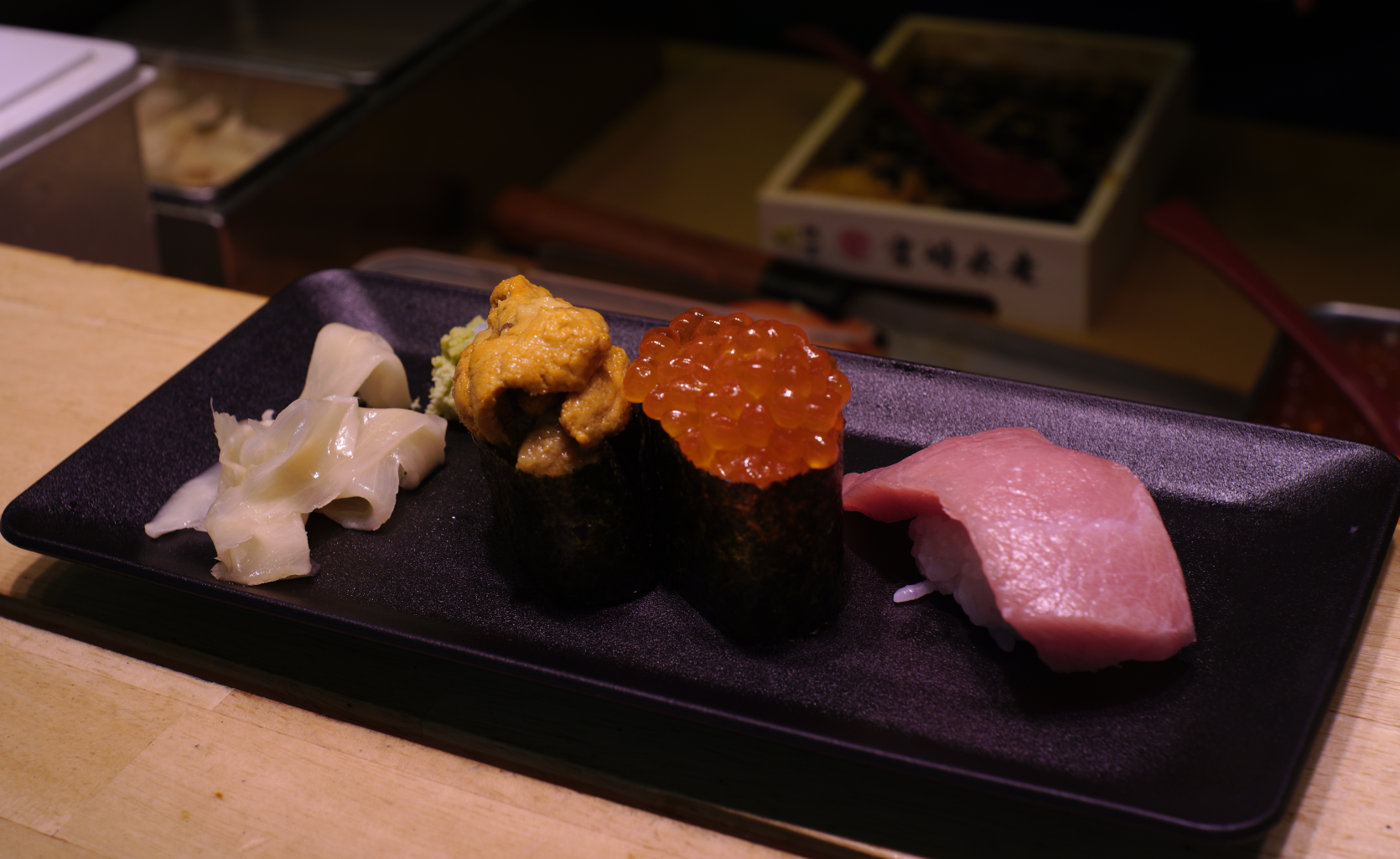刀眉老大爷的手作寿司,海胆,鲑鱼子和大腹,和冷冻过的口感和油脂的味道完全不一样,每颗寿司很大,一口吃不下,温度比环境稍高一点,可能老大爷手比较热XD。海胆前味很鲜后味回甘,鲑鱼子鲜中带微咸,大腹则有种红肉的口感且油香四溢。芥末和姜片的味道很温和,姜片可以在吃完每个寿司后白嘴嚼一嚼,重置一下味觉